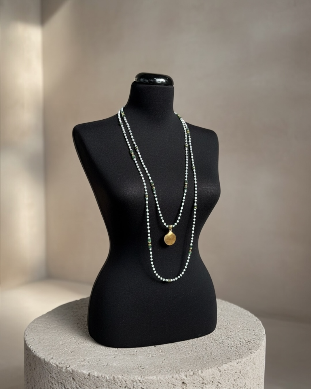 A bold yet elegant fusion of natural textures and ocean-inspired charm. This handcrafted necklace features premium glass beads, gold-toned hematite, authentic Afghan beads, and rich African turquoise—each adding depth, color, and vibrant character. Finished with a gold-plated seashell pendant for a radiant coastal look.