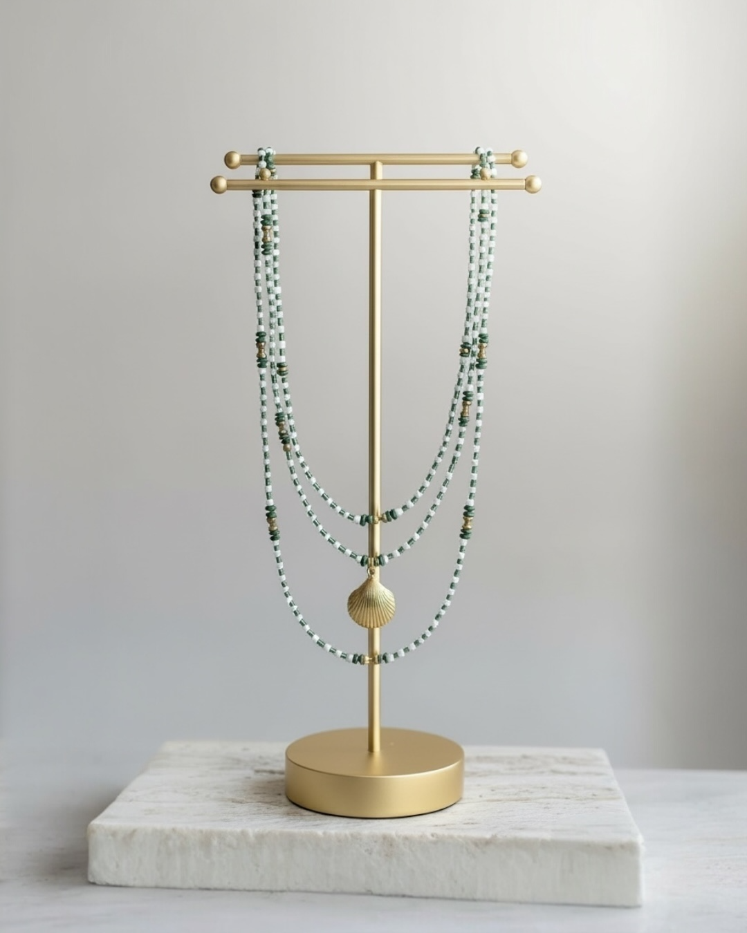 A coastal–boho statement blending African turquoise and a gold seashell charm.