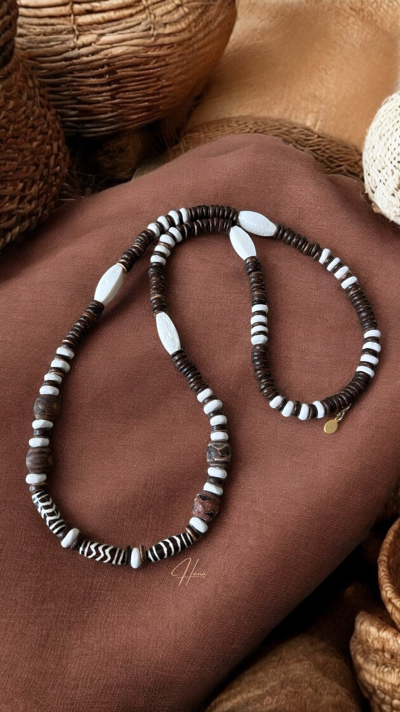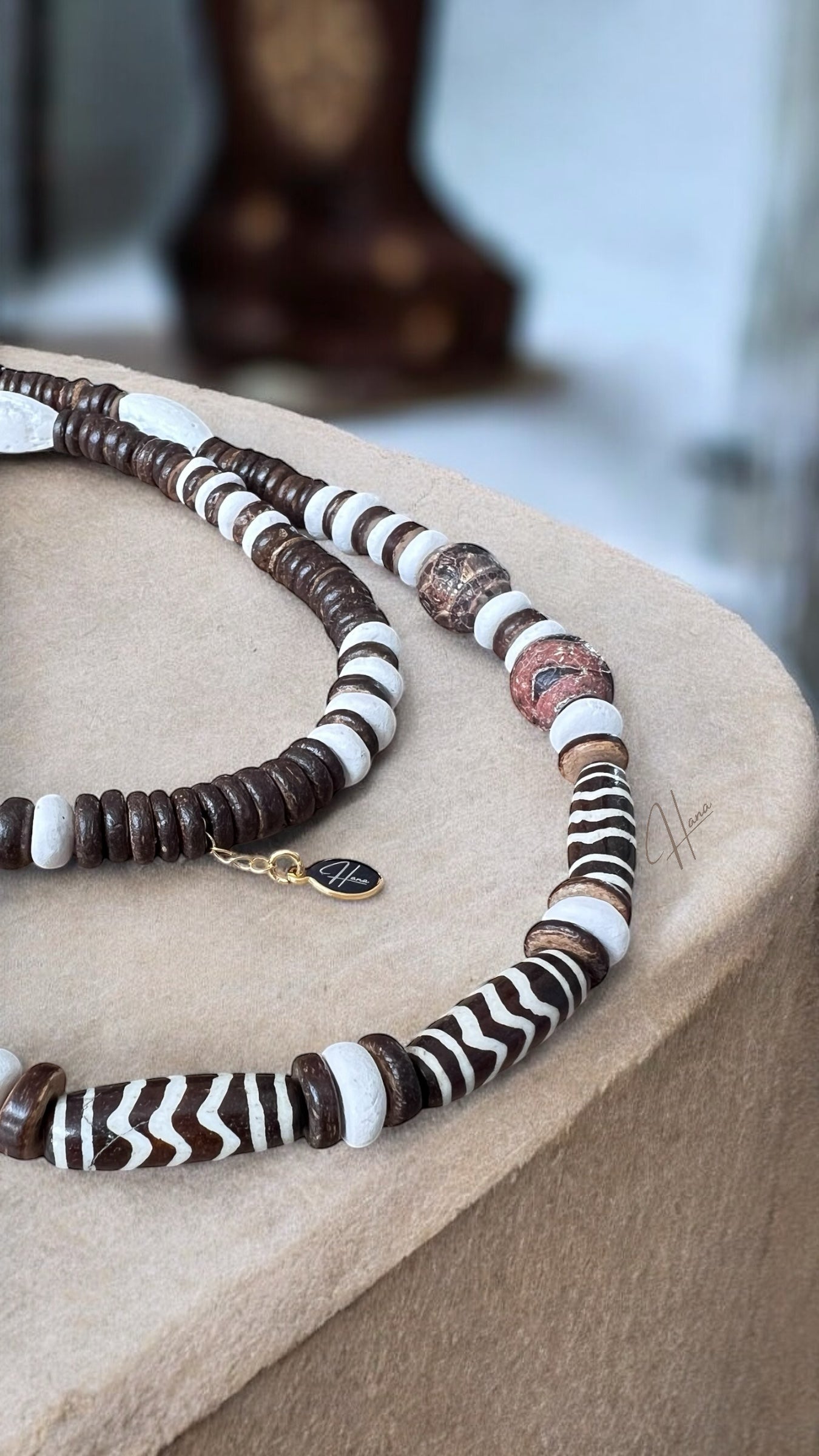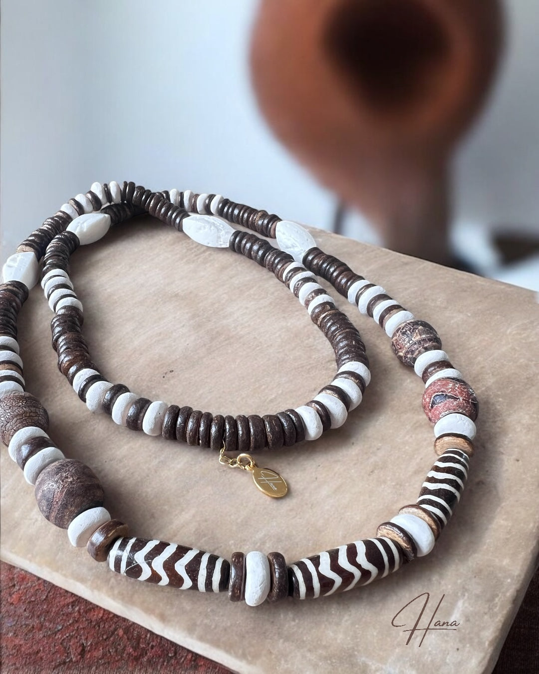 A handmade necklace designed by Hanaa Elshami embodies the principles of connection to the land and every woman's roots. In this way, the necklace serves as a reminder of who are our ancestors and where we are heading in our life grounding with the confidence every women who wears it.