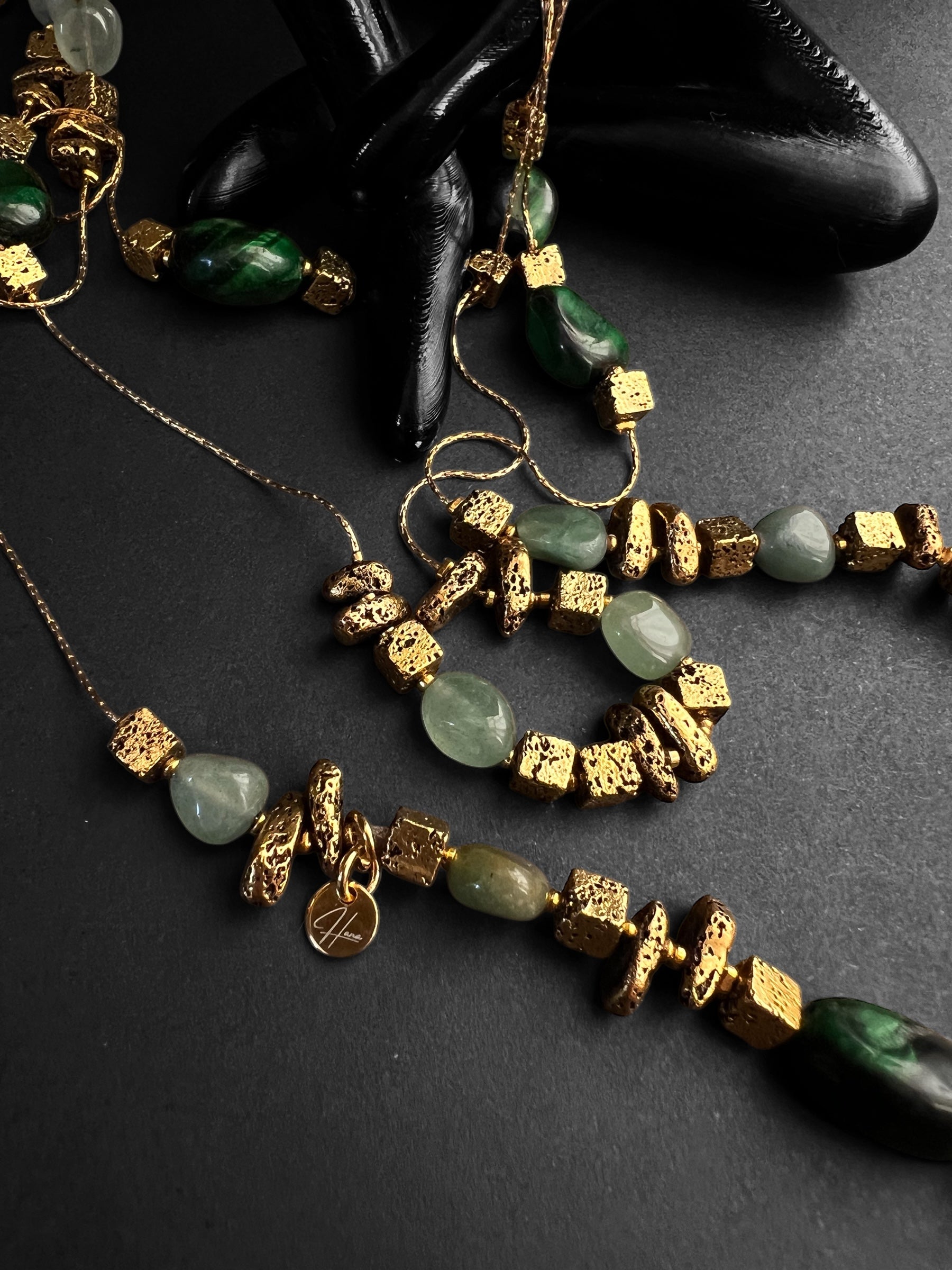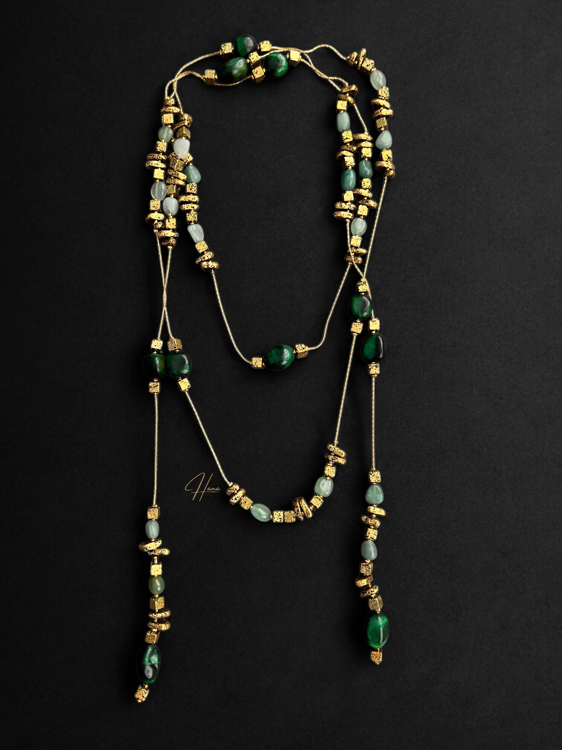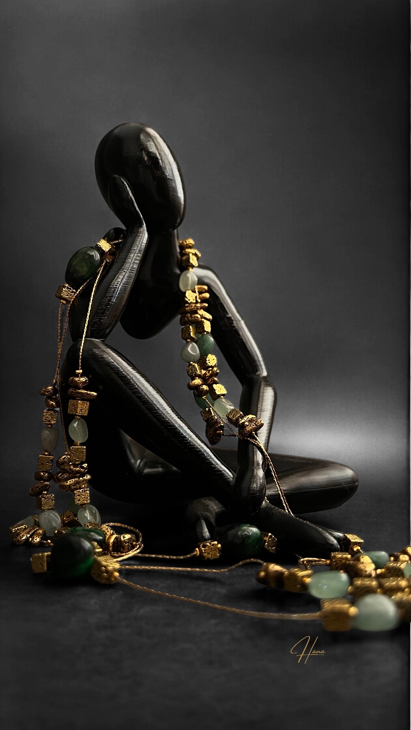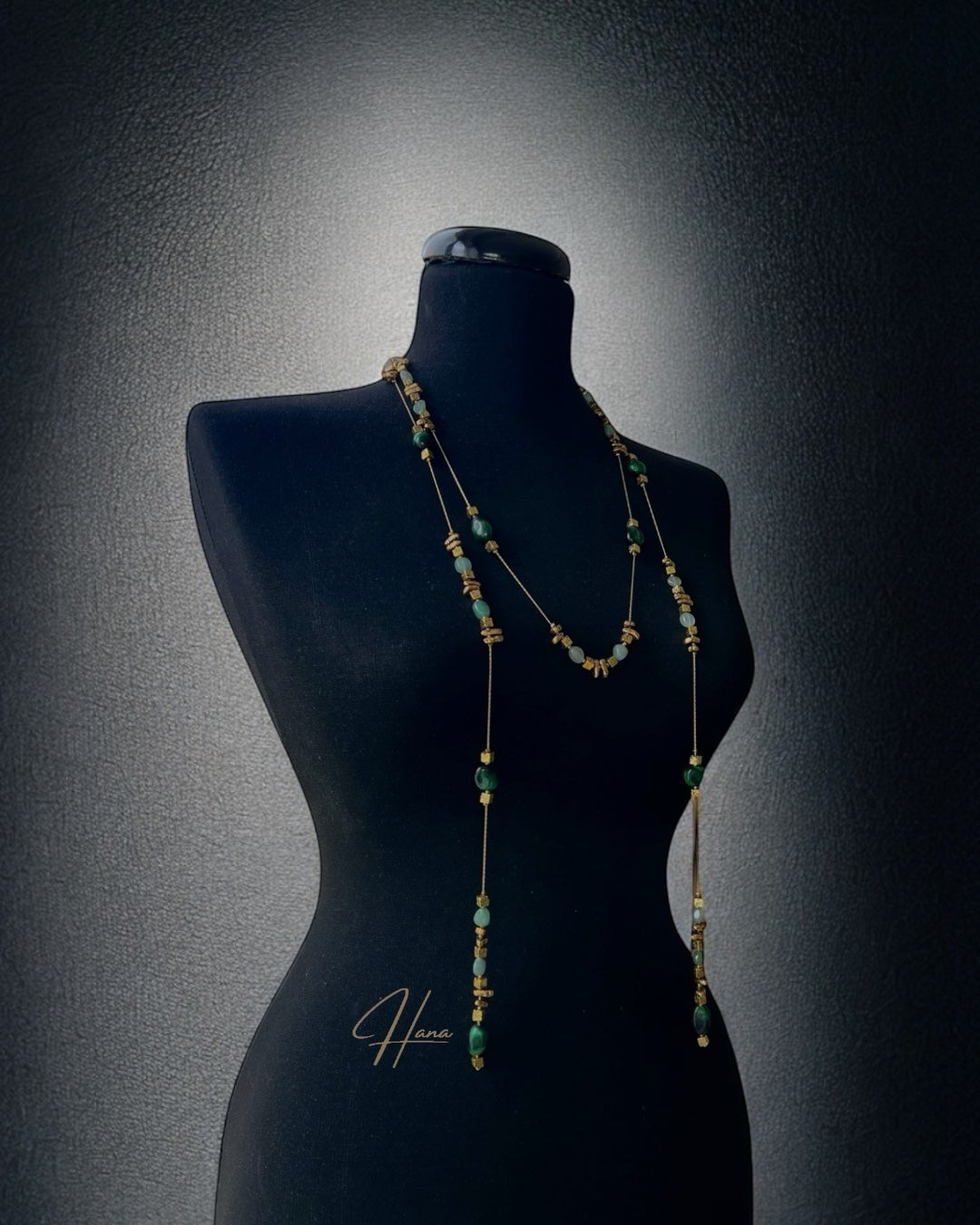 A handmade necklace designed with love by Hanaa Elshami adorned with nature's finest stones artfully aligned along a gold plated chain, it adds a touch of supremacy and royalty inspiring piece and resilience, Elysium invites you to embrace your unique spirit and elevate your soul.