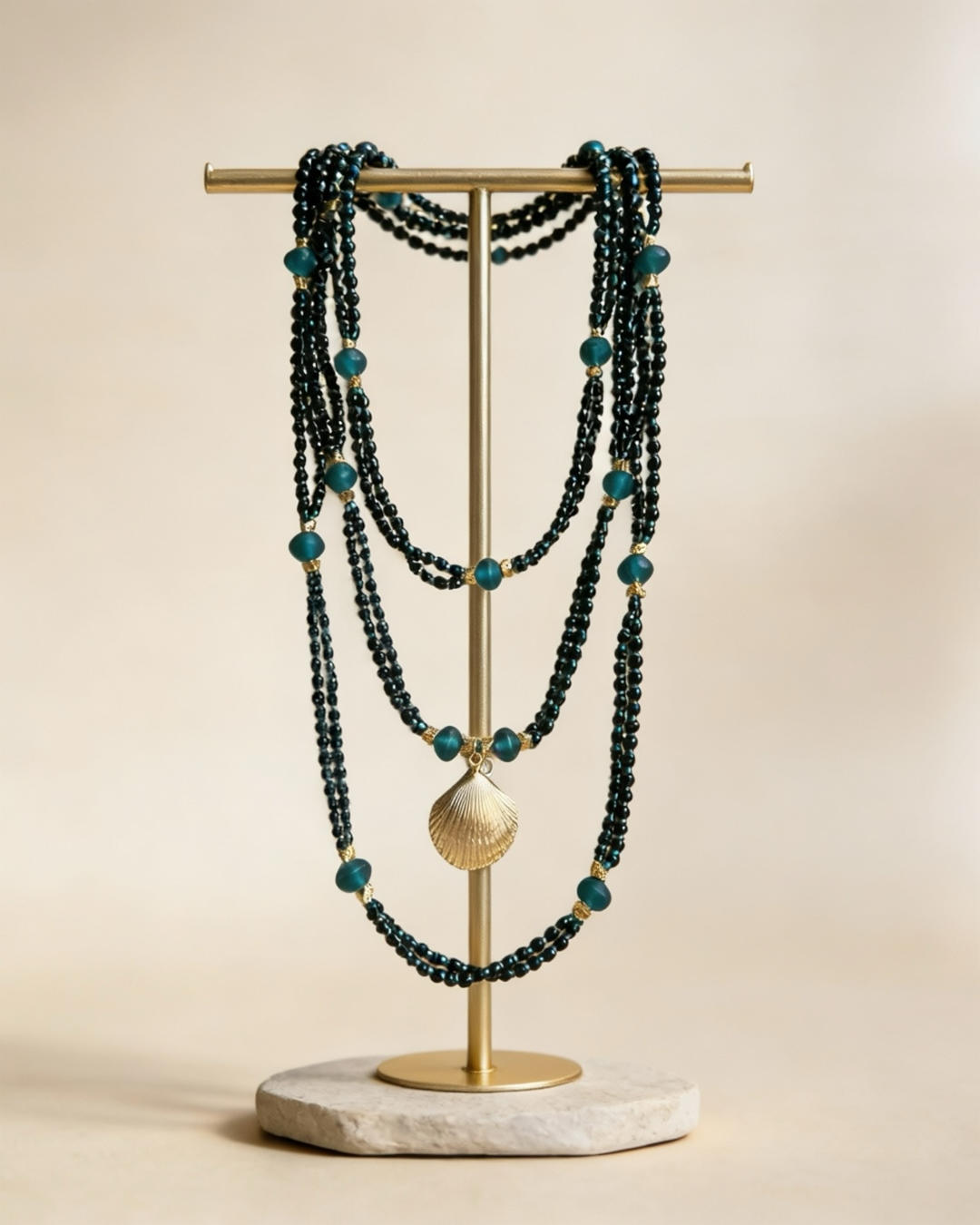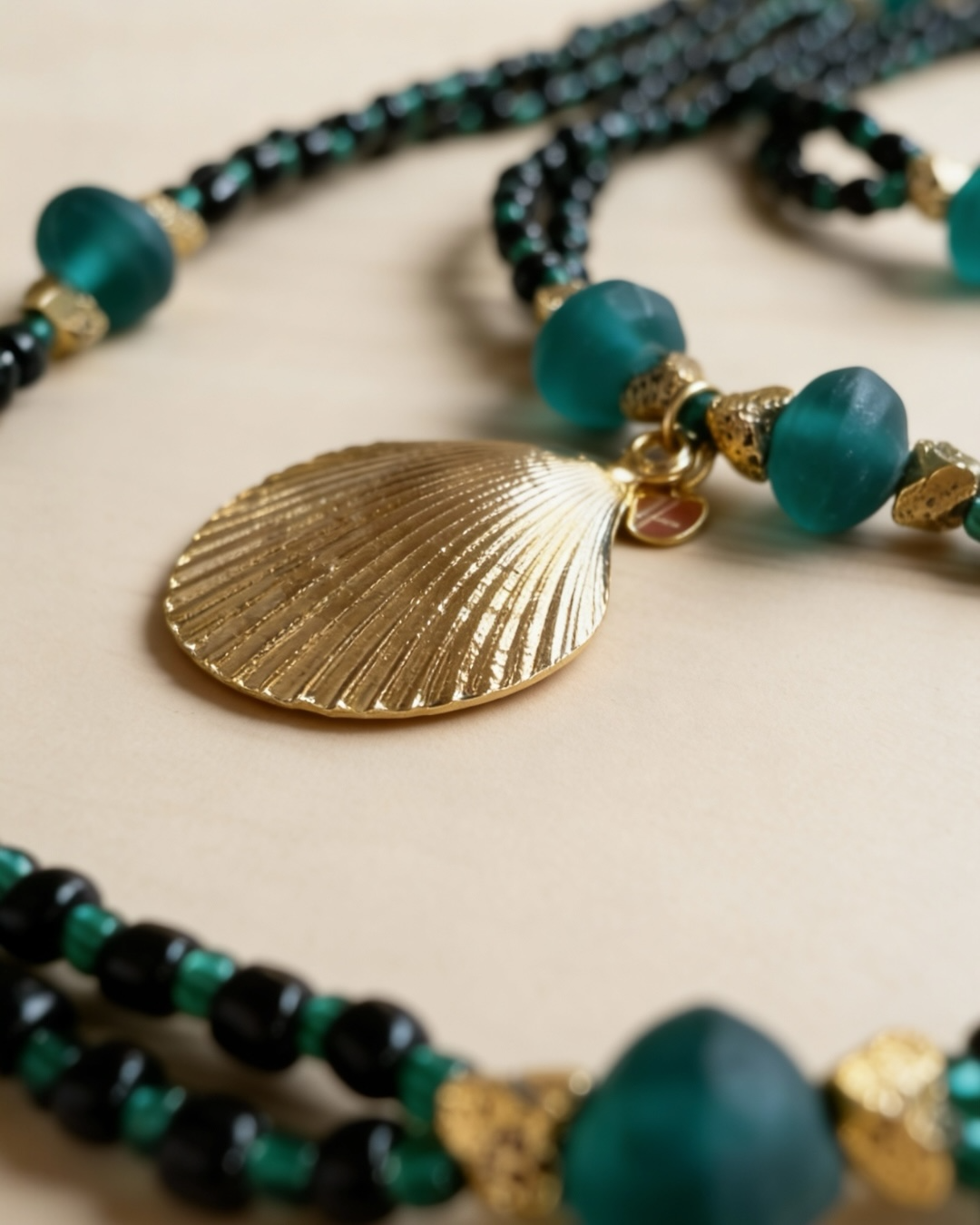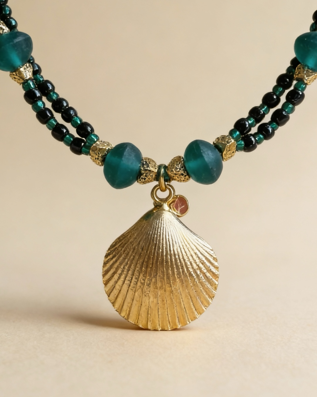 This distinctive design features a shell-inspired charm crafted from gold-plated stainless steel, paired with natural lava stones and delicate glass beads, creating a perfect balance between strength and femininity.